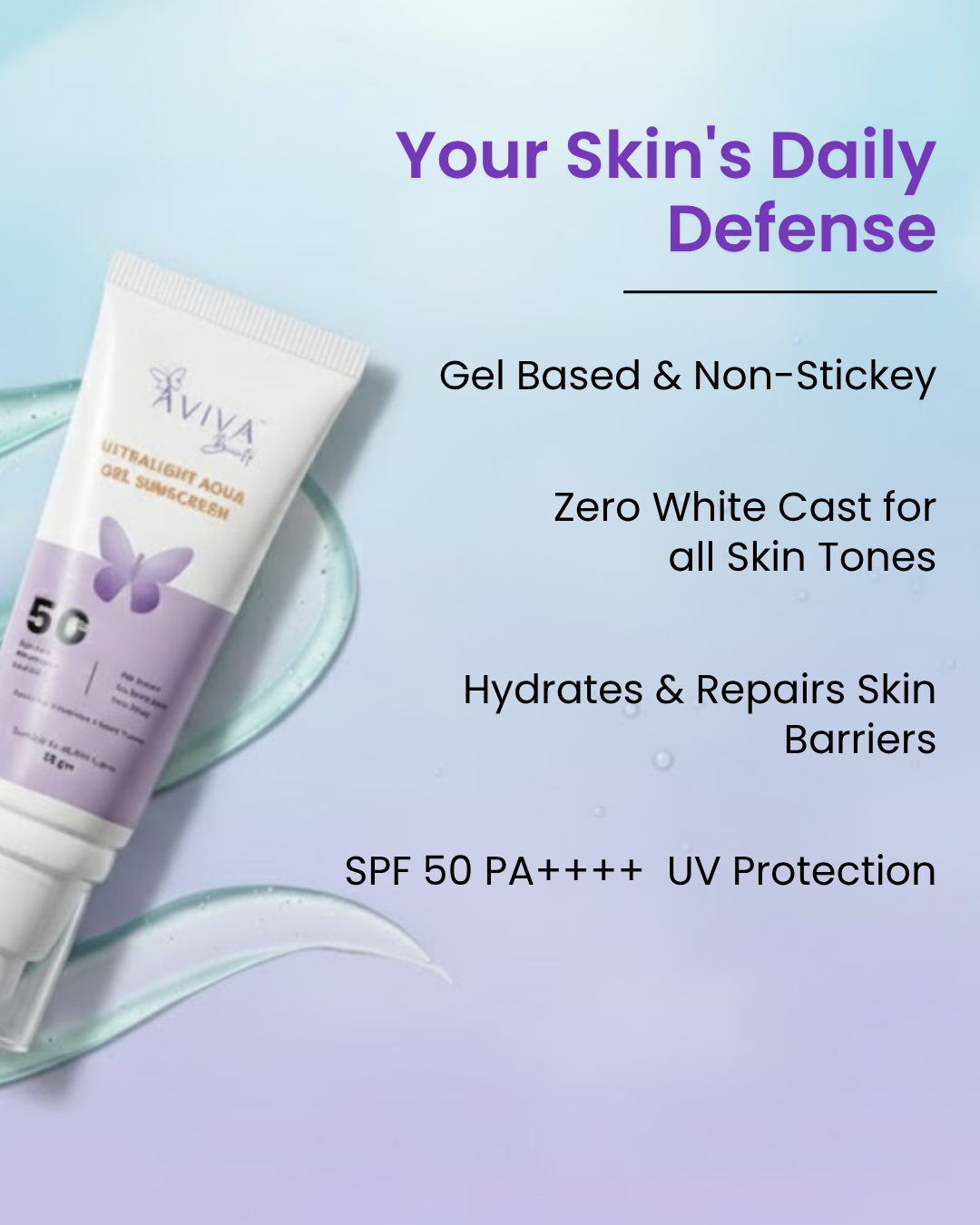 Aviva Beauty’s Ultra Light Aqua Gel Sunscreen SPF 50 PA++++ is a hybrid sunscreen that combines high protection with skincare benefits.